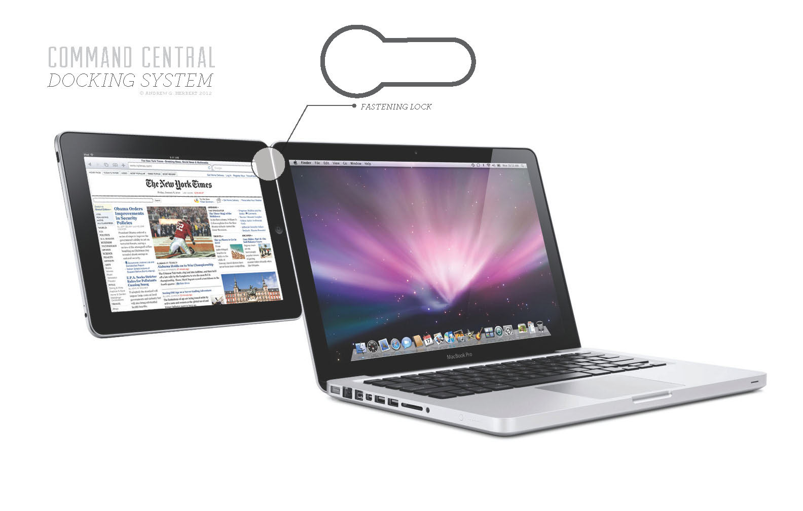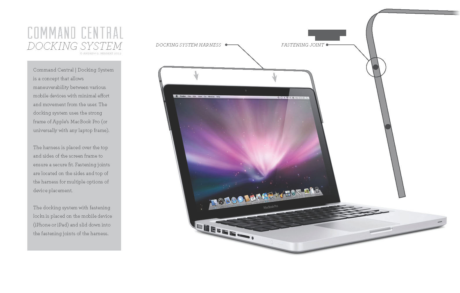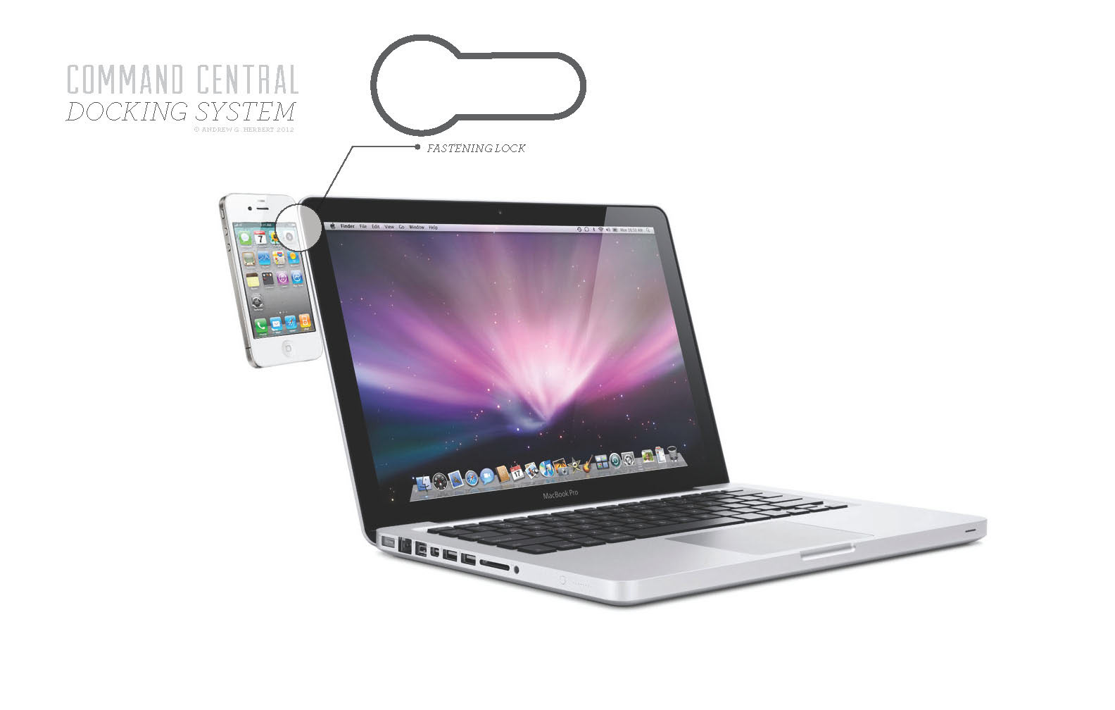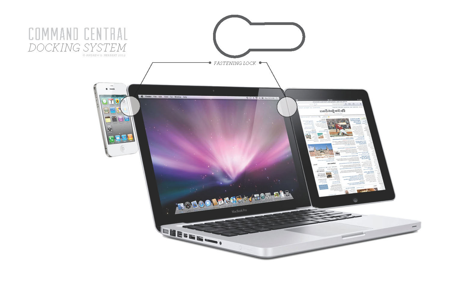 Command Central | Docking System is a product concept that allows maneuverability between various mobile devices with minimal effort and movement from the user. The docking system uses the strong frame of Apple’s MacBook Pro (or, potentially, universally with any laptop frame).