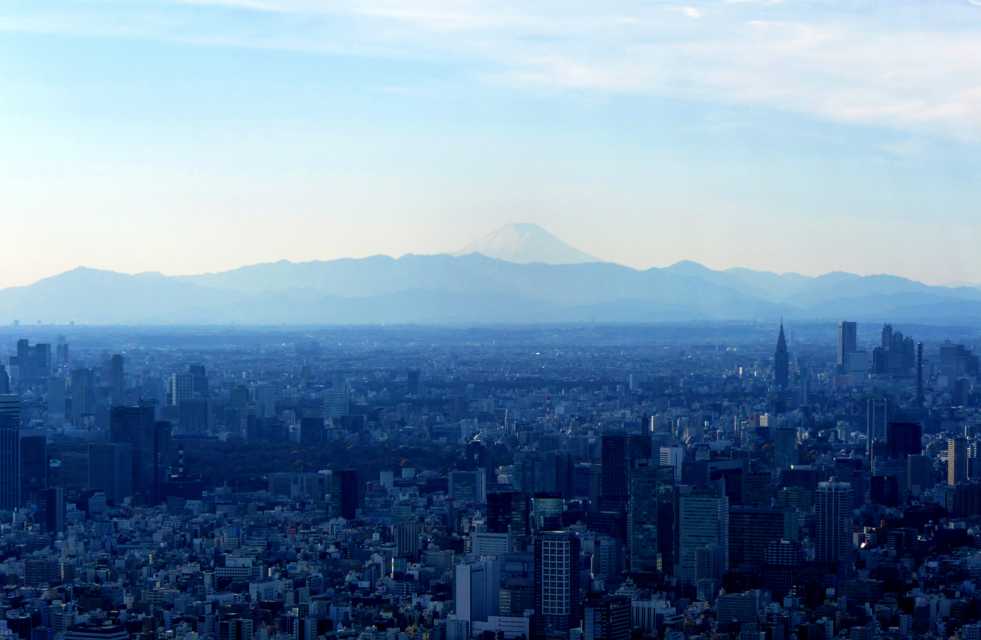 Tokyo cityscape with Mt. Fuji overlooking from a distance.